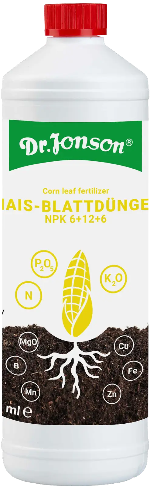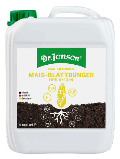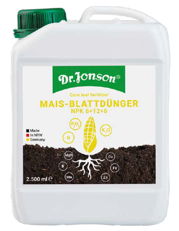 Mais-Blatt-Dünger 6+12+6 wird vorbeugend oder bei Nährstoffmangelerscheinungen ab Stadium 3 (2. Bis 3. Blatt) der Maispflanze wiederholt eingesetzt.